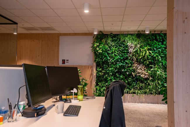 Den levende planteveggen reduserer stress, svevestøv, støy og øker konsentrasjon og produktivitet samtidig som den skaper bedre luftkvalitet i lokalet, absorberer giftige gasser i rommet og pumper ut oksygen.